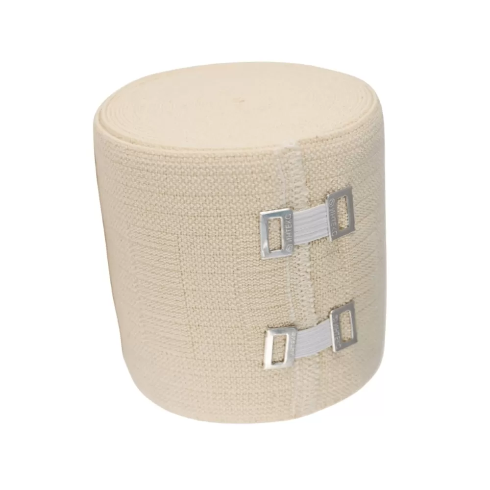 Бинт медицинский эластичный компрессионный представляет собой тканую эластичную ленту средней степени растяжимости (100% - 150%) в цвете натурального сырья. Размер: ширина 8 см, длина 3,5 м. Закрепляется металлическими застежками.Показания
