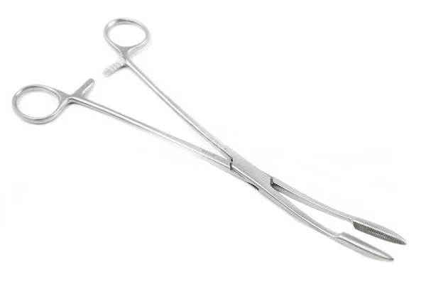 Корцанг изогнутый хирургический инструмент для захватывания и подачи стерильных инструментов и перевязочного материала, представляющий собой зажим с кремальерой, длинными изогнутыми браншами и овальными губками с насечкой.