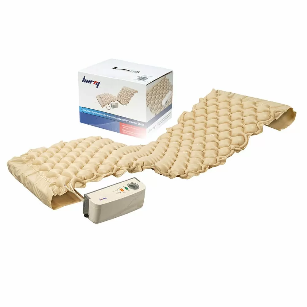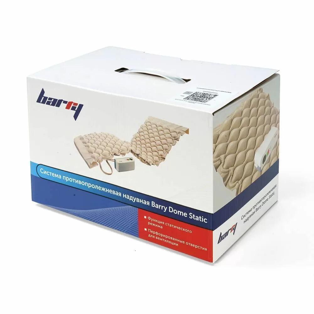 Barry Dome Static представляет собой ячеистый противопролежневый матрас, рекомендованный для профилактики и терапии пролежней начальной и средней степени тяжести. Благодаря своей простоте в использовании, система подходит как для домашнего ухода, так и для применения в медицинских учреждениях. В комплект входит матрас и компрессор. Продолжительность одного рабочего цикла составляет - 12 мин. (6 минут - первый контур, 6 - минут второй контур), при включенной функции статики - 6 минут для полного надувания системы.