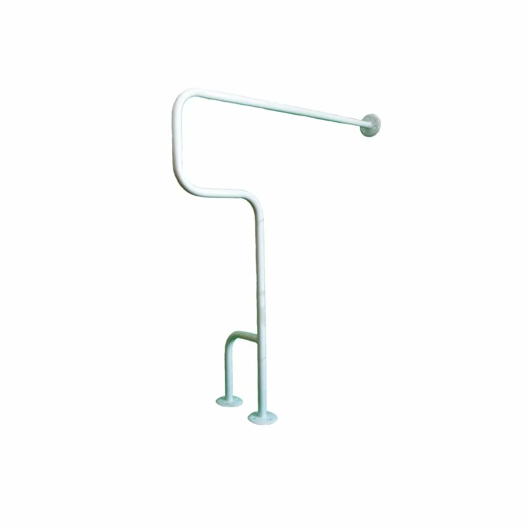 Поручень трёх опорный настенно-напольного крепления. Диаметр фланцев 85 мм, с тремя крепежными отверстиями под шурупы диаметром 4 мм в каждом из них.