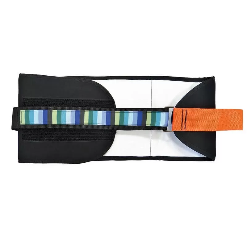 - На ремне располагается цветовая шкала, позволяющая при наложении контролировать величину стягивания пояса. Петля пояса предназначена для силового упора при фиксации больного. Окончательная фиксация выполнена в виде застежки типа «Велькро».