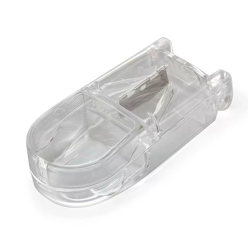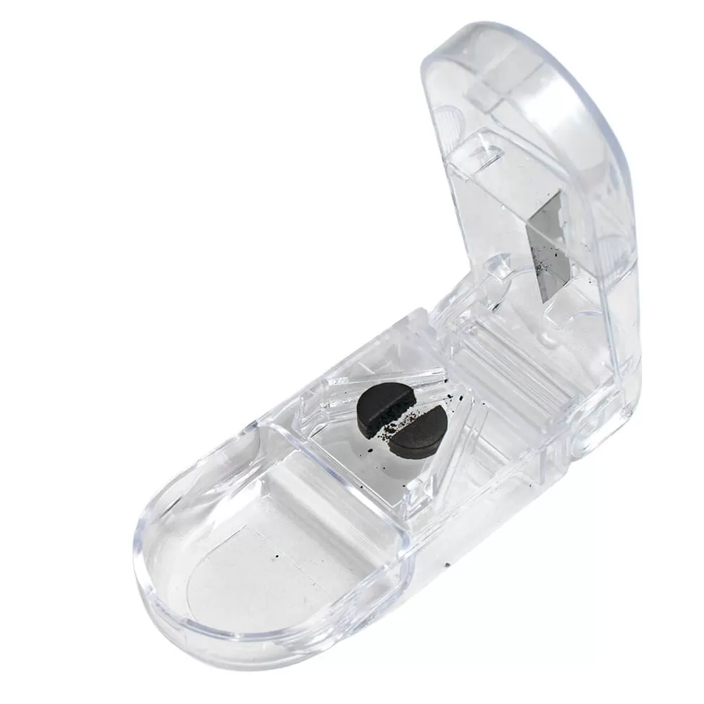 - Установите разделитель на твердую поверхность, откройте крышку и поместите таблетку в ячейку лезвием "V"- образной формы.