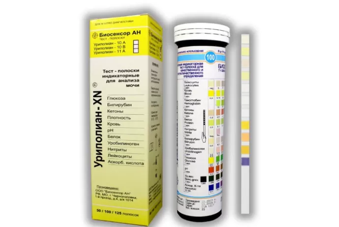 Тест-полоски индикаторные для качественного и полуколичественного определения: глюкозы, белка, крови/гемоглобина, лейкоцитов, нитритов, кетоновых тел, pH, билирубина, уробилиногена, относительной плотности, аскорбиновой кислоты в моче Уриполиан-XN предназначены для качественного и полуколичественного определения крови (свободного гемоглобина), кетоновых тел, белка, нитритов, билирубина, уробилиногена, глюкозы, pH, относительной плотности, лейкоцитов, аскорбиновой кислоты в моче в медицинских учреждениях, а также в домашних условиях (для экспресс-анализа диагностики in vitro).
