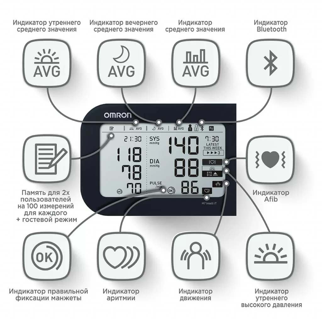 - Индикатор утреннего среднего значения. На дисплее отображаются средние еженедельные утренние значения измерений (период расчета зависит от модели тонометра).
