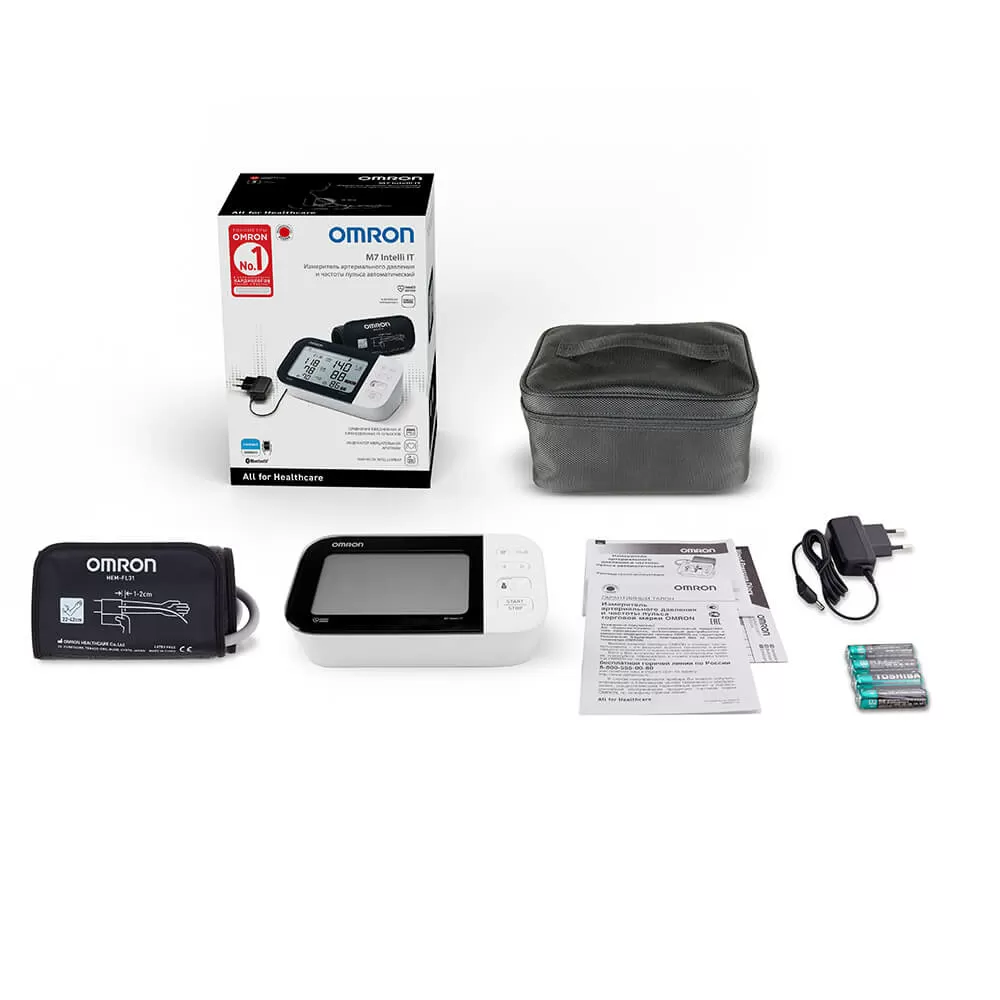 Электронный блок, манжета компрессионная HEM-FL31, адаптер переменного тока HHP-CM01, элементы питания типа «АА», 4 шт., чехол для хранения прибора, руководство по эксплуатации, инструкция по установке приложения, гарантийный талон, журнал для записи артериального давления |
